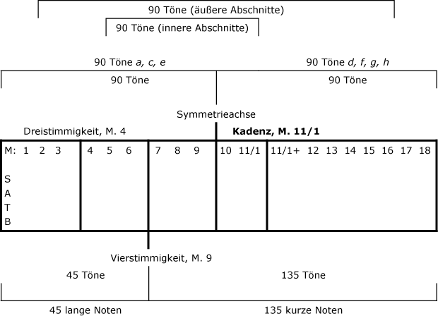 Vergegenwärtigen wir uns noch einmal die Mottobehandlung im Kyrie I. Das Motto trat dort in zwei Zusammenhängen auf, einmal als durchgehendes Mottoband und zum anderen in Form einer Imitation zwischen Altus und Tenor. Wenn wir diese Mottoimitation im Kyrie I als einen Hinweis auf jene Imitation im Christe deuten, deren acht Töne wir bei der proportionalen Analyse nicht mitzählten, dann deutet das durchgehende Mottoband im Kyrie I auf jenes im Kyrie II hin und zeigt an, daß hier nun die Töne des durchgehenden la-sol-fa-re-mi-Bandes beim Zählen außer acht gelassen werden sollen. So spekulativ dieser Schritt zunächst erscheint, so überzeugend stellen sich seine Ergebnisse dar. Das Kyrie II besteht aus insgesamt 260 Tönen. Ohne die 80 Töne, die das Mottoband bilden, bleiben 180. Die Symmetrieachse zwischen M. 9/10 teilt auch die 180 Töne des ›reduzierten‹ Kyrie II wieder in zwei gleiche Hälften von 90:90. Wie im Kyrie I entspricht dieses Verhältnis auch der Unterteilung in ›äolische Dreiklangstöne‹ (a, c, e) und übrige Töne (d, f, g, h). Auch die äußeren und inneren Abschnitte stehen zueinander in diesem Verhältnis. Orientiert man sich an der Achse zwischen M. 6/7, die den Eintritt der Vierstimmigkeit markiert, so stehen ›links‹ von ihr 45 Töne und ›rechts‹ von ihr 135. Dieses entspricht mit 45:135 dem Verhältnis zwischen langen und kurzen Notenwerten (ohne bzw. mit Halsung).