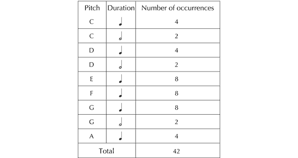 Adopting a ‘traditional’ analytical mindset, it was the exact repetition of phrases that immediately became apparent: lines 1 and 2 are reprised to form the conclusion of the song (lines 5 and 6), before which, in a short central section, line 4 echoes line 3. Hence the piece has a simple ternary construction: A B C C A B. Moreover, taking into account approximate repetition (in the form of transposition), it is evident that line 3 is a variant of line 2. Hence, the global structure of Twinkle, Twinkle can be expressed as: A B1 B2 B2 A B1. This is all perfectly straightforward. However, examining the statistics relating to individual notes, it was evident that my conventional account of the nursery rhyme’s structure by no means captured all the repetition that is present. Twinkle, Twinkle comprises six lines of seven notes, making a total of 42 distinct sonic events. Yet there are only nine different ones, as follows (see Figure 3).