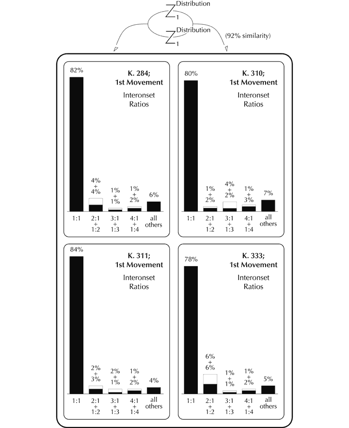 It is in the domains of pitch and perceived time that the great majority of ‘background’ organisation occurs (and which is by far the most musically significant and sophisticated). For example, underlying the perceived temporal structure is the presence of an essentially regular beat, which is maintained throughout the movement (subject, for sure, to interpretive variation in performance). This suggests that zygonic activity in the domain of perceived time played a part in the creation of K. 333 (and has subsequently been stimulated in listeners’ minds), both within the first movement itself and between this and other movements. Moreover, although Mozart left no specific indication of tempo, the first movement of K. 333 is typically executed at a rate similar to those adopted for many others: further evidence of primary zygonic imitation in terms of both composition and performance.[72] The choice of metre (common time) and its constancy may be considered to have been derived interoperatively[73] too. Then, IOIs between successive notes fall within a limited range, which is commonplace in other pieces, implying intraopus and interoperative imitation.[74] The IOIs correspond closely to the set of durations that Mozart deploys, a consequence of the fact that most notes succeed one another contiguously. Only eight different durations are utilised in over 2,500 discrete events, suggesting the operation of extensive systems of zygonic relationships.[75] The fact that similar durational sets are found in stylistically congeneric movements also indicates the presence of interoperative organisation.[76] Stylistically, the distribution of relative durational values also tends to be highly structured, with just two note-lengths (in the ratio 2:1) typically accounting for over 80% of all those used in Western classical pieces, according to Paul Fraisse.[77] This finding is supported by the analysis shown in Figure 11, which indicates, moreover, an overall 86% similarity in the distribution of relative durations pertaining to the first movements of three broadly representative piano sonatas by Mozart (K. 284, K. 310, K. 311) in addition to K. 333.[78]