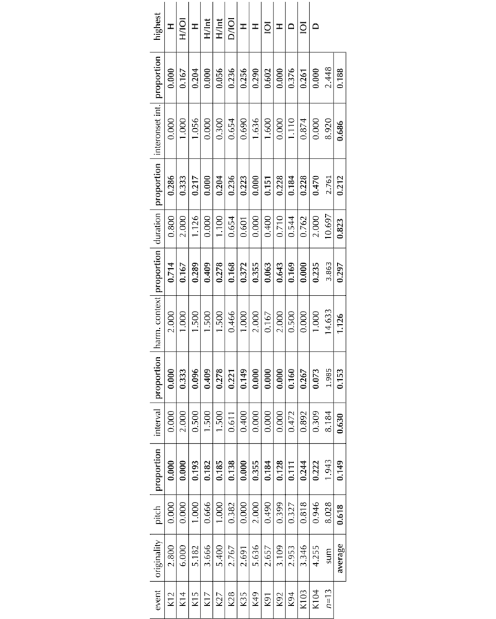 Elsewhere,[80] I discuss the relevance for listeners of statistics such as these (and those pertaining to pitch that follow), and examine how zygonic organisation underpins expectation in the process of hearing and re-hearing the music. How it is that such distributions come to be used time and again by composers, with the large-scale imitation at a probabilistic level that these imply, is an intriguing question that awaits future research.