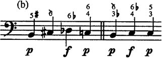 In den beiden von Bach beigefügten Notenbeispielen erhalten die konsonanten Dreiklänge und ihre Umkehrungen ein Piano, die dissonanten (zwischendominantischen) Septakkorde ein Forte und zwar, wie es scheint, unabhängig von ihrer metrischen Taktposition. Im Hinblick auf die Praxis räumt Bach allerdings ein: