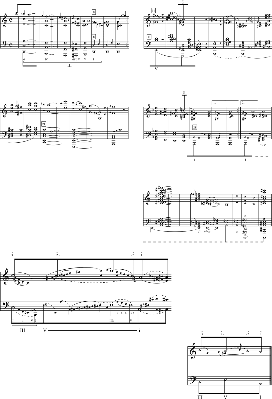 Der letzte Abschnitt wird in den drei Deutungen unterschiedlich aufgefasst. Eine Herausforderung stellt der Quartsextakkord in Takt 31 dar: Die erwartete Fortschreitung dis°7-gis°7-a6/4 über dem Orgelpunkt E wird in den unerwarteten Plagalschluss gelenkt. In A (vgl. Bild 2) suggeriert die Kennzeichnung o7/V (T. 30) und V9 (T. 34) eine neuerliche authentische Kadenz in die Tonika, die sich dann aber als Zwischendominante zur Subdominante entpuppt. In B (vgl. Bild 3) sind dieselben Harmonien in eine Quintfallbewegung eingebettet, die von einer Nebennotenharmonie (H4/3) eingeleitet wird und sich in den Plagalschluss entlädt (der Plagalschluss ist durch die Nebennotenharmonie gis4/3 prolongiert). Der Quintfall stützt den übergreifenden Quartzug d2-c2-h1-[a1] als Prolongation der 1 der Urlinie, dessen Beginn vom Anfangsmotiv gebildet wird.