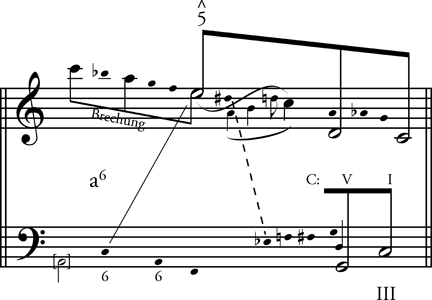 Lediglich in C2 und in D (also der hier nicht wiedergegebenen zusätzlichen Skizze Schenkers zum dritten Abschnitt der Komposition) wird auf die klangliche Situation in den Takten 31–33 (wo der Hörer einen kadenzierenden Quartsextakkord mit konventioneller Auflösung erwartet) explizit Bezug genommen.